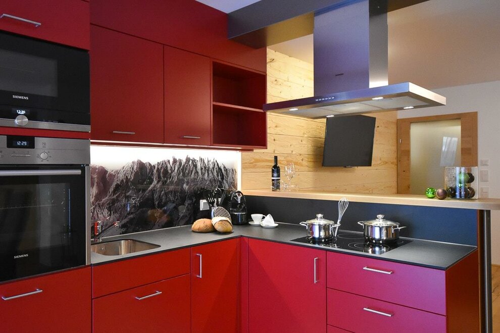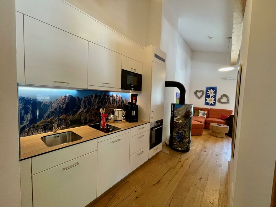 Zeer ruime woonkamer met houtkachel, knusse hoek met uittrekbank (extra bed) en grote maïsgraanstafel, grote flatscreen met kabel-tv, compleet uitgeruste keuken met eettafel. Groot balkon met uitzicht op de Hochkönig en het tuinhuis. Voldoende ruimte voor een kinderbedje.Kenmerken kamer/appartement