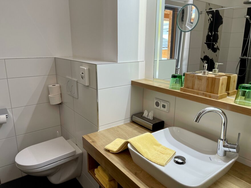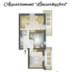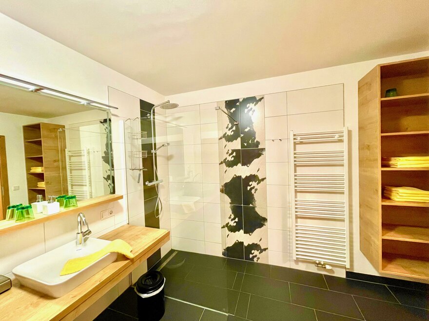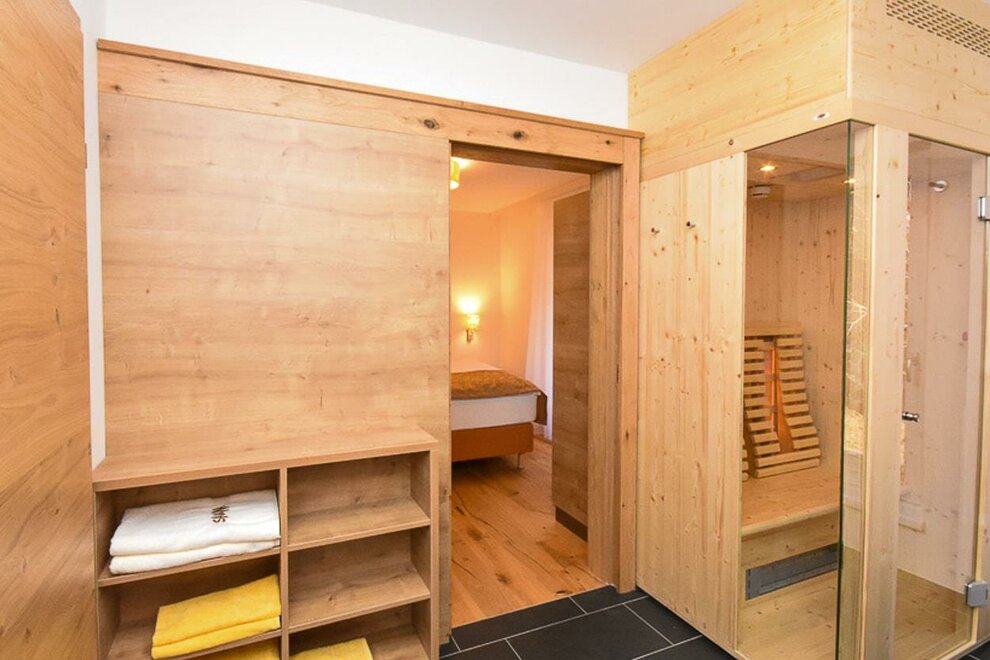 Tijdloos ontwerp, geïnspireerd op onze alpine leefruimte en onze bakkersfamilietraditie.Een slaapkamer met kingsize boxspringbedden met een grote badkamer met douche, apart toilet, radio, cosmeticaspel, haardroger en infraroodcabine. Tweede slaapkamer met kingsize boxspringbedden, een gezellige bank (extra bed), een westelijk gelegen balkon en een eigen badkamer met douche, toilet, radio, cosmeticaspel en haardroger.