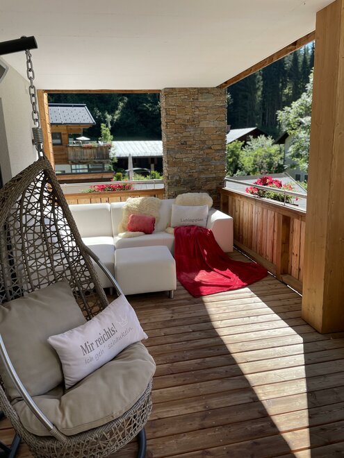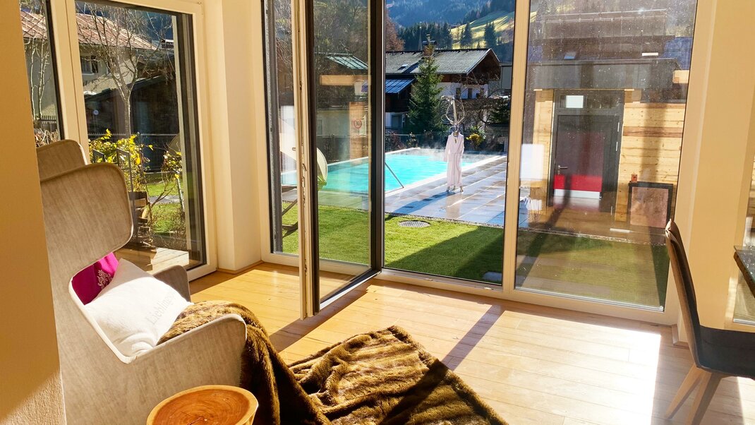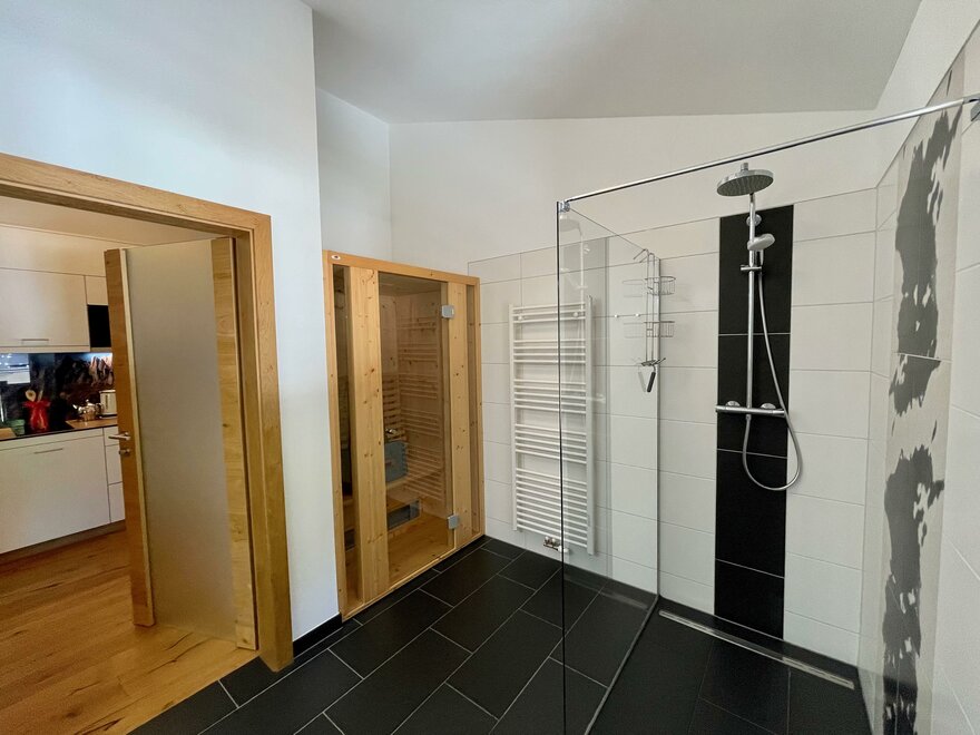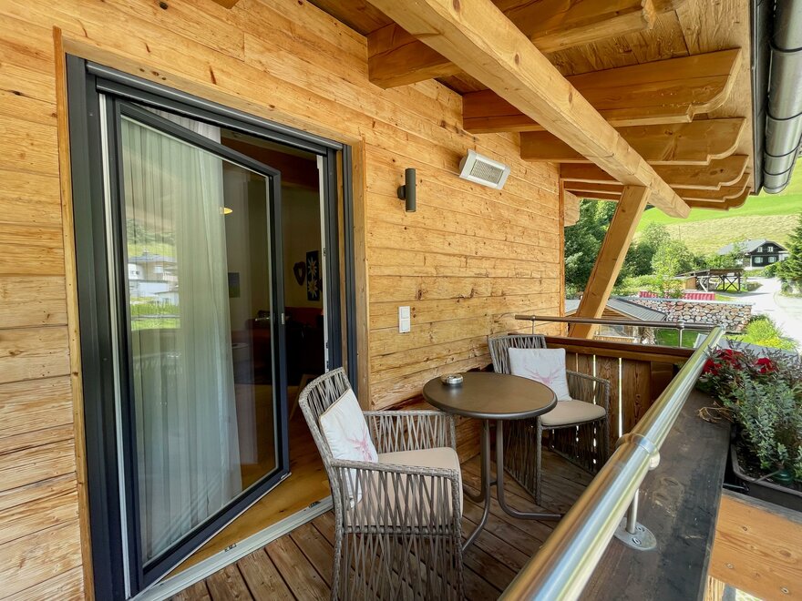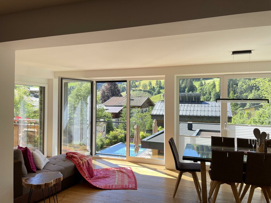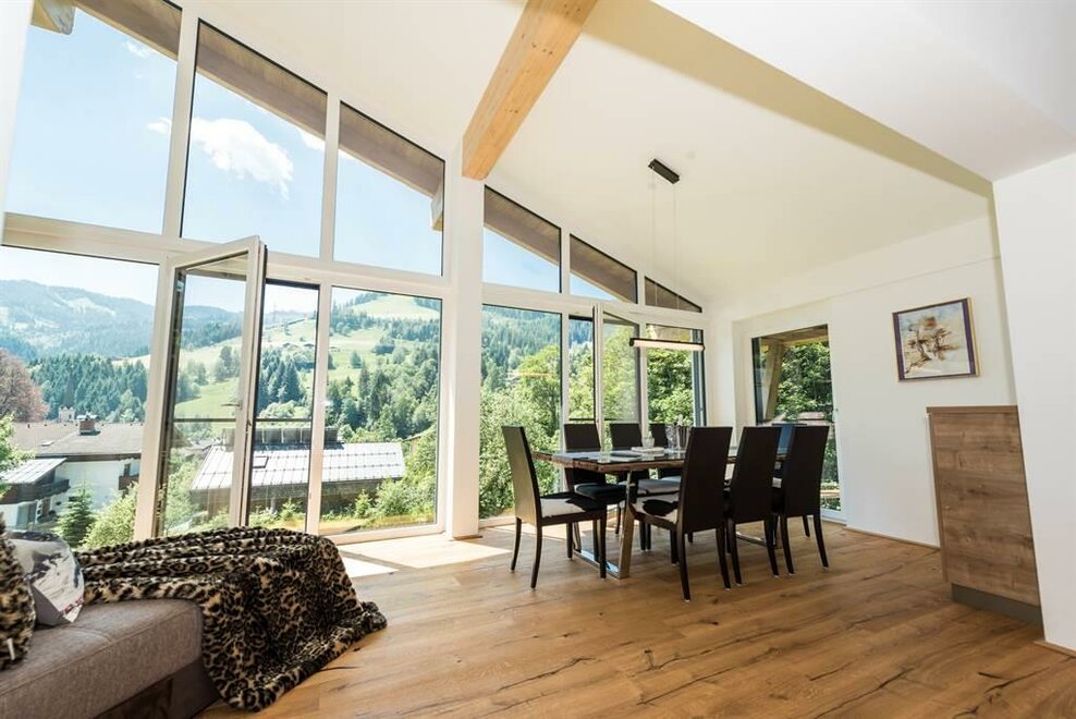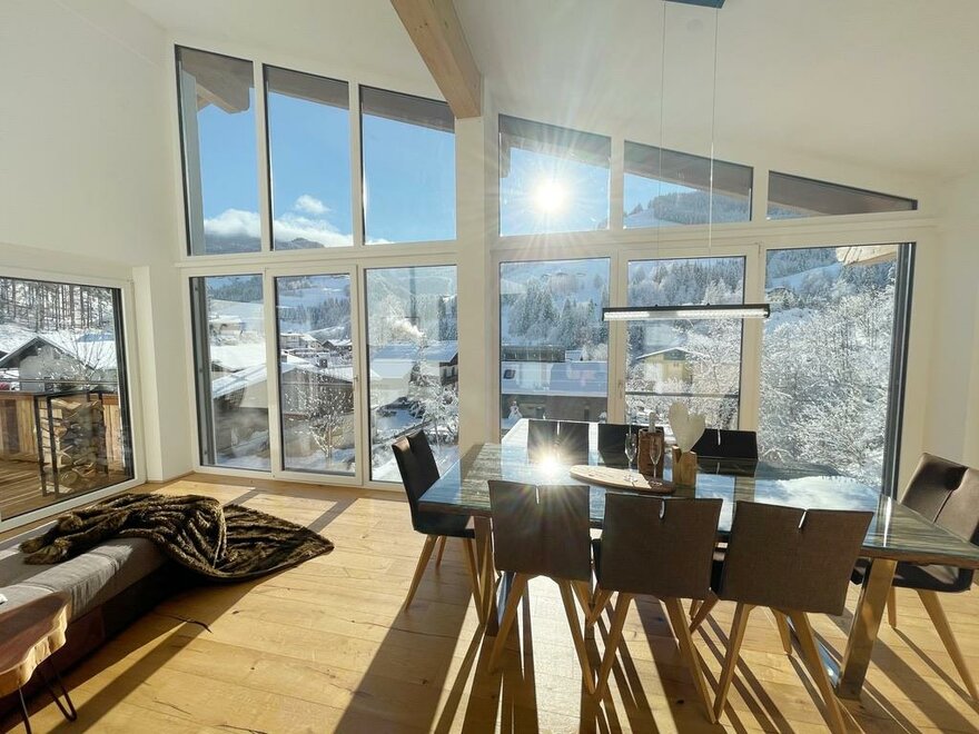 Zeer royale woonruimte met een kachel, knusse hoek met uitschuifbare bank (extra bed) en grote molensteen tafel, grote flatscreen met kabel-tv, volledig uitgeruste keuken met eettafel. Grote balkon met uitzicht op de Hochkönig en het tuinhuis. Voldoende ruimte voor een campingbedje.Een slaapkamer met kingsize boxspringbedden met een grote badkamer met douche, gescheiden toilet, radio, cosmeticaspiegel, föhn en infraroodcabine. Tweede slaapkamer met kingsize boxspringbedden, een gezellige bank (extra bed) en een balkon op het westen en een eigen badkamer met douche, toilet, radio, cosmeticaspiegel en föhn.
