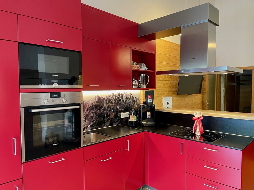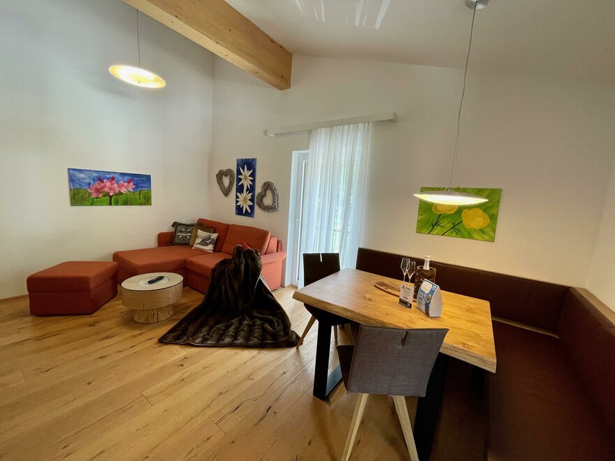 Zeer royale woonruimte met kachel, knusse hoek met uitschuifbare bank (extra bed) en grote molensteentafel, grote flatscreen met kabel-tv, volledig uitgeruste keuken met eettafel. Groot balkon met uitzicht op de Hochkönig en het tuinhuis. Voldoende ruimte voor een ledikant.Kenmerken kamer/appartement