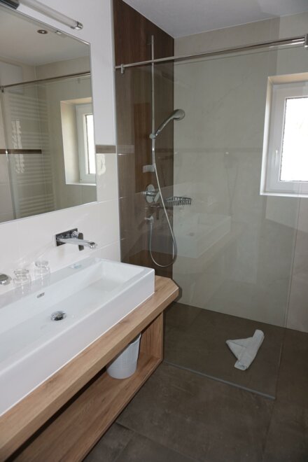 Het appartement biedt een zeer ruime badkamer met douche en een apart toilet.