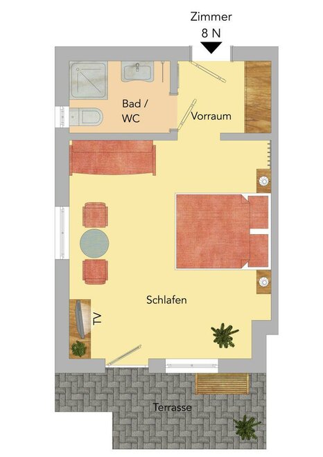 (App. grootte: 28 m²; Uitklapbank als slaapmogelijkheid voor 2 personen mogelijk!)Appartement met woon-slaapkamer, 28 m², douche, WC, balkon.