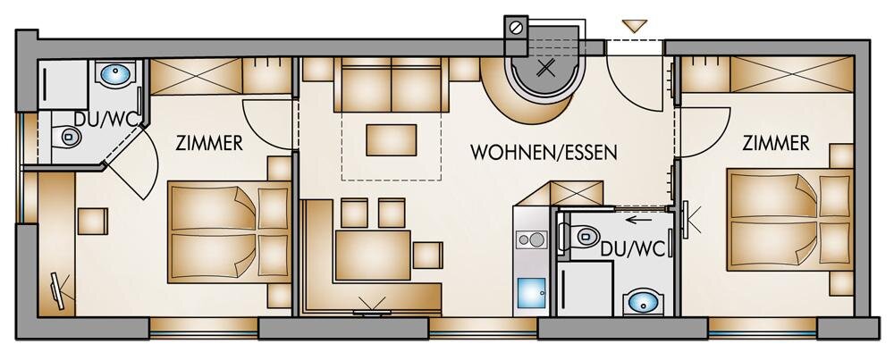 Tot 4 personen | 60 m² - 67 m² | 2 Appartementen: 1 slaapkamer met een tweepersoonsbed en 1 slaapkamer met twee eenpersoonsbedden | 2 Appartementen: 1 slaapkamer met een tweepersoonsbed en een tweepersoonsbed op de open loggia boven de woonruimte | ruime woonkamer | badkamer met douche en apart toilet | balkon of wintertuin met uitzicht op de Hochkönig | geschikt voor stellen, gezinnen en vrienden
