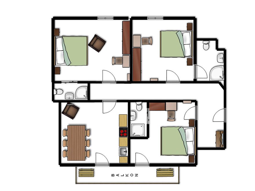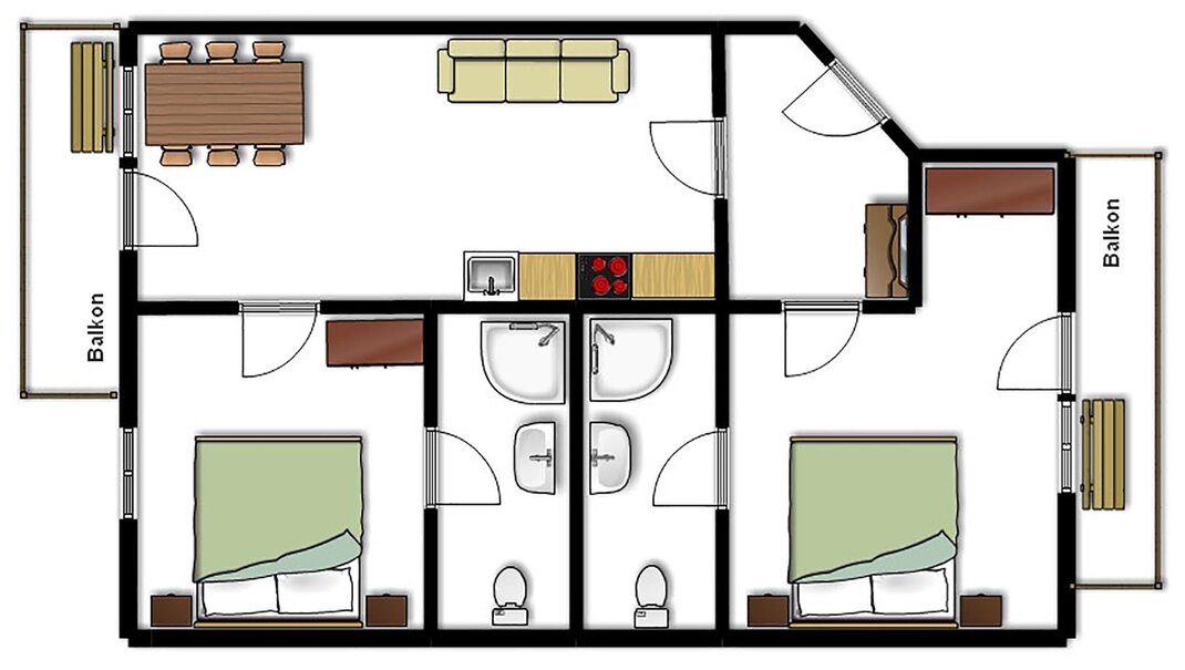 Cosy apartment with balcony and beautiful view. Each sleeping room with toilet and shower.