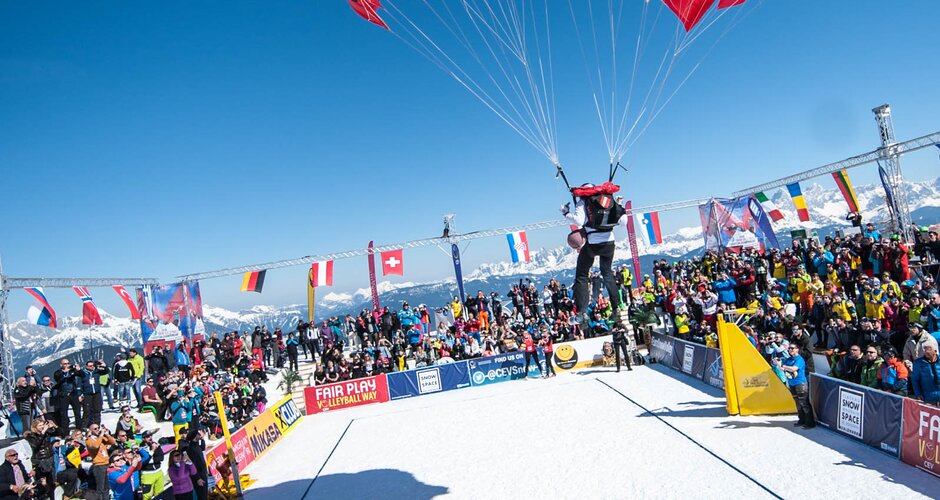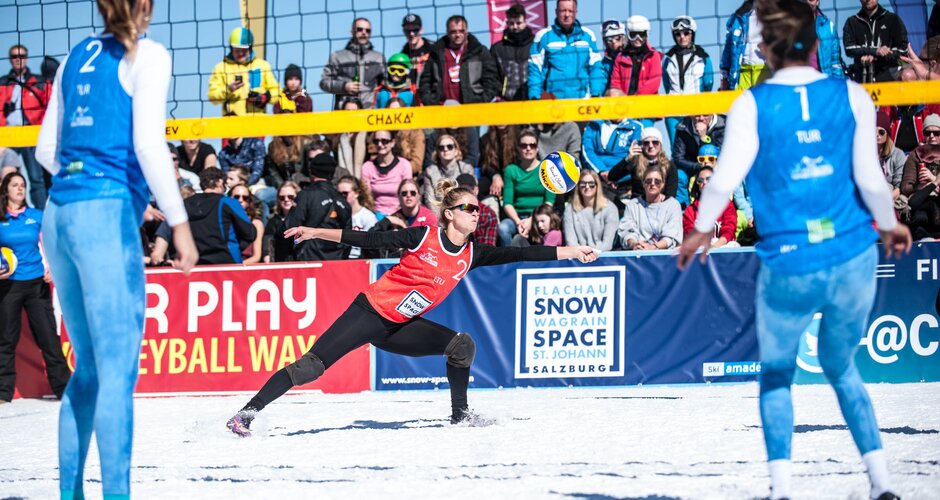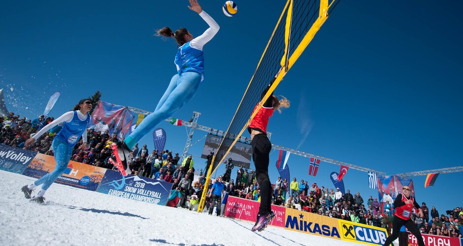Bumping, setting and spiking: When you are thinking of beach volleyball, sand, beaches and bikinis come rather to your mind than tons of snow and long underwear. But the Snow Volleyball Tour works differently. An extraordinary competition takes place in Wagrain-Kleinarl from 24. till 26. March 2023, directly at the Flying Mozart mountain station on 1.850 meters above sea level.