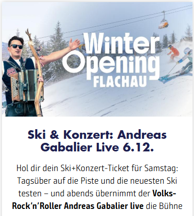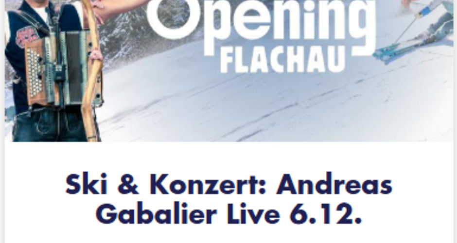 Skifahrer auf Piste, links Andreas Gabalier mit Ziehharmonika, Textinfos zum Event | © Flachau Tourismus