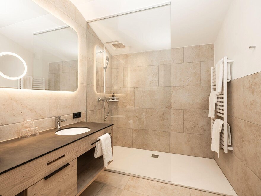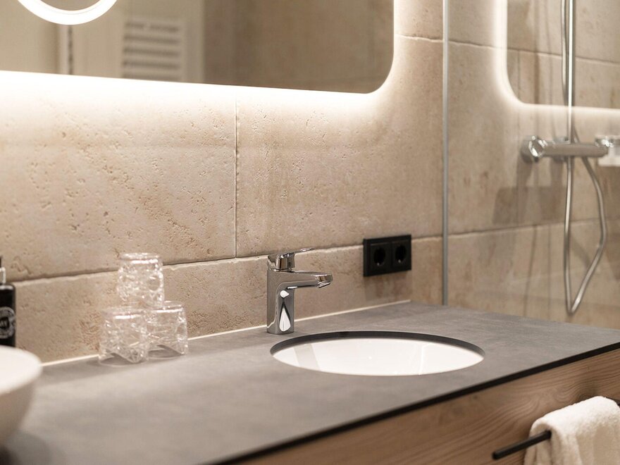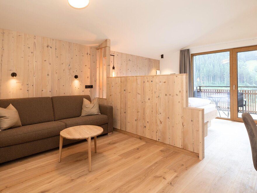 Beautiful, spacious, bright, light-filled hotel studio with a separate living area (sliding door), balcony, oak hardwood floor, bathroom with barrier-free shower, separate toilet, hairdryer, desk, large TV, safe, broadband internet, underground parking space, and panoramic glass front with a view of the mountains.