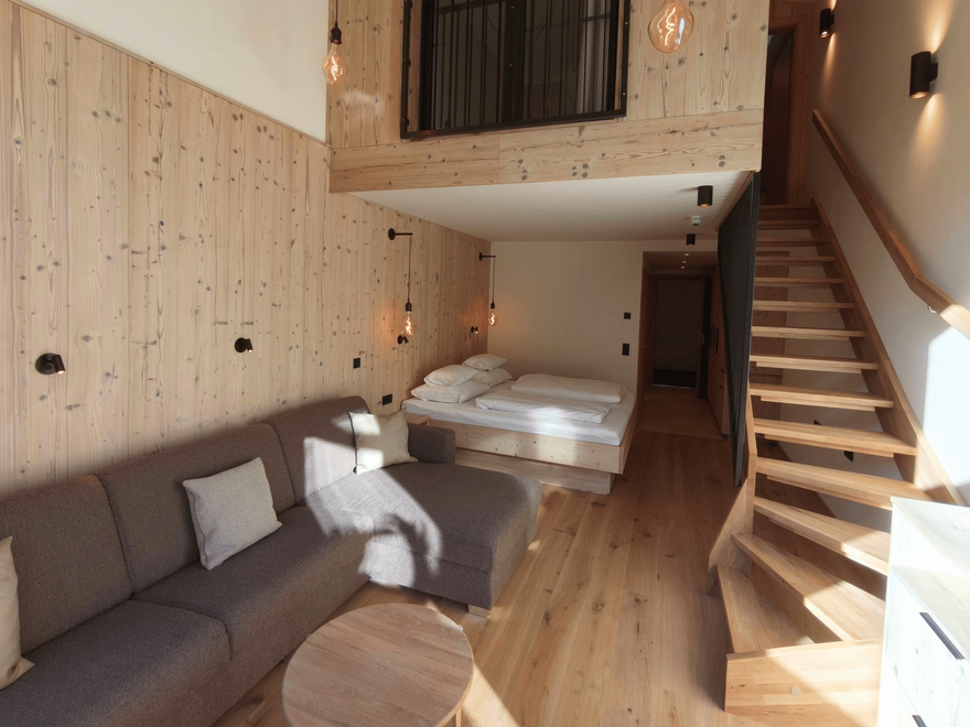 Beautiful, spacious 2-story family studio with two separate sleeping areas, [nbsp]balcony overlooking the mountains, bathroom with shower and separate WC, hairdryer, oak wooden floor, [nbsp]cozy living area, desk, cable TV, safe, high-speed internet, and underground parking.