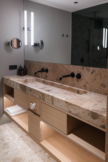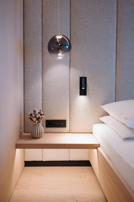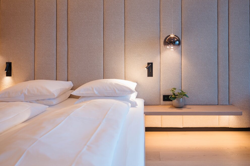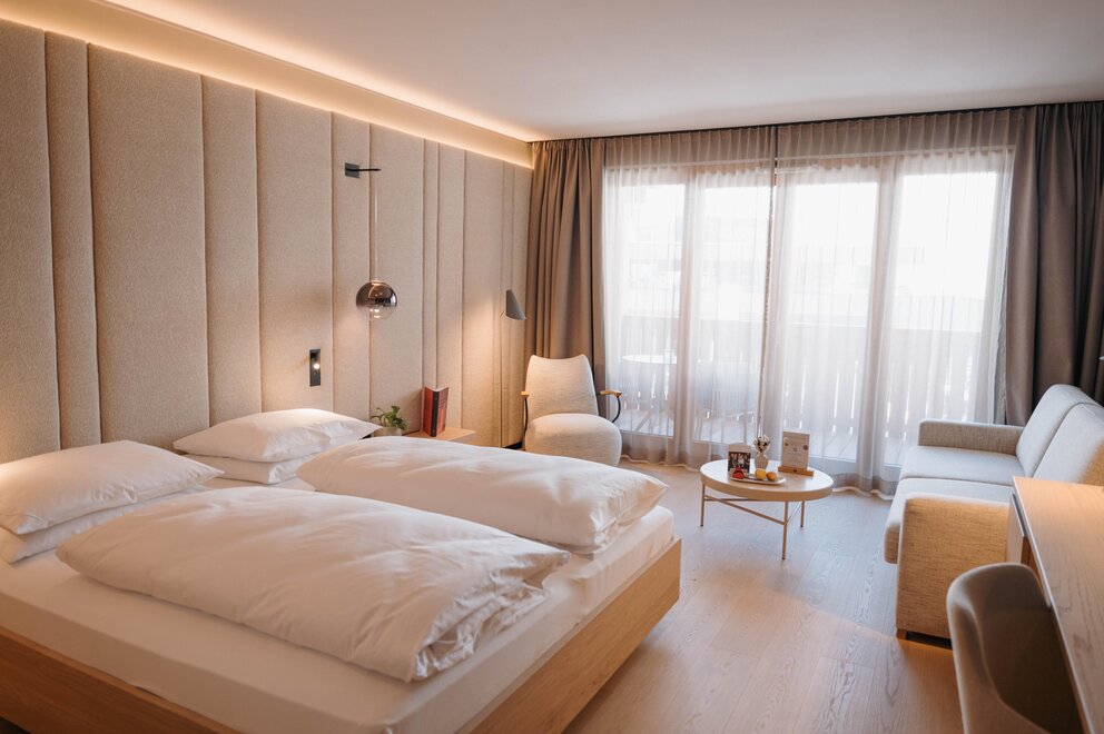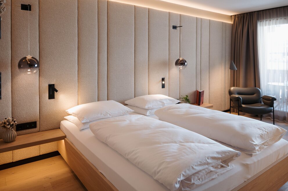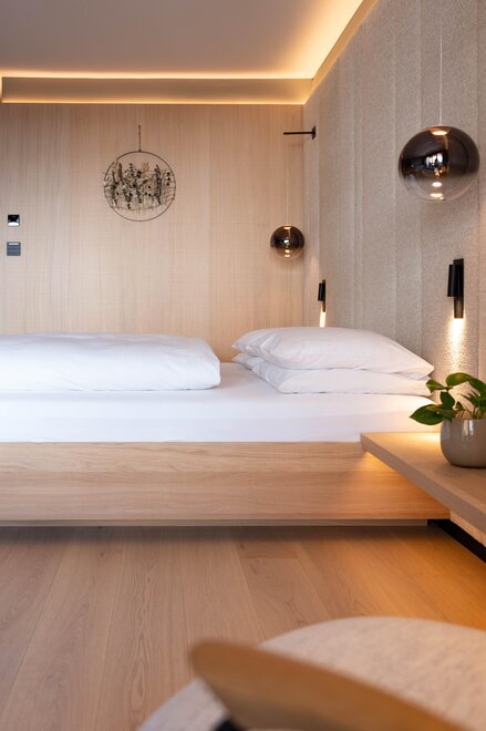 From May 2026, our newly designed double room "Bauchgefühl" will welcome you, creating a particularly warm and inviting atmosphere with great sensitivity, natural materials, and a harmonious color concept. Generously planned and flooded with light, it offers the ideal space to arrive and feel comfortable.