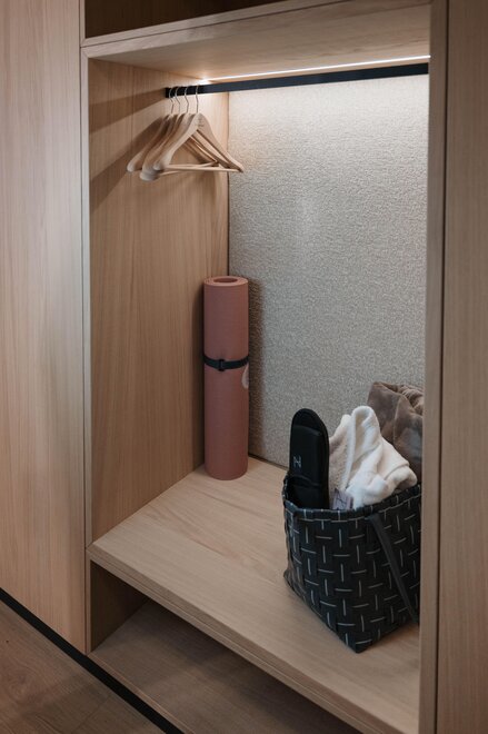 Approx. 68 m² with 22 m² south-facing loggia. Open bathroom with rain shower, double basin, hairdryer and illuminated cosmetic mirror. Separate toilet with basin.Wyposażenie pokoju