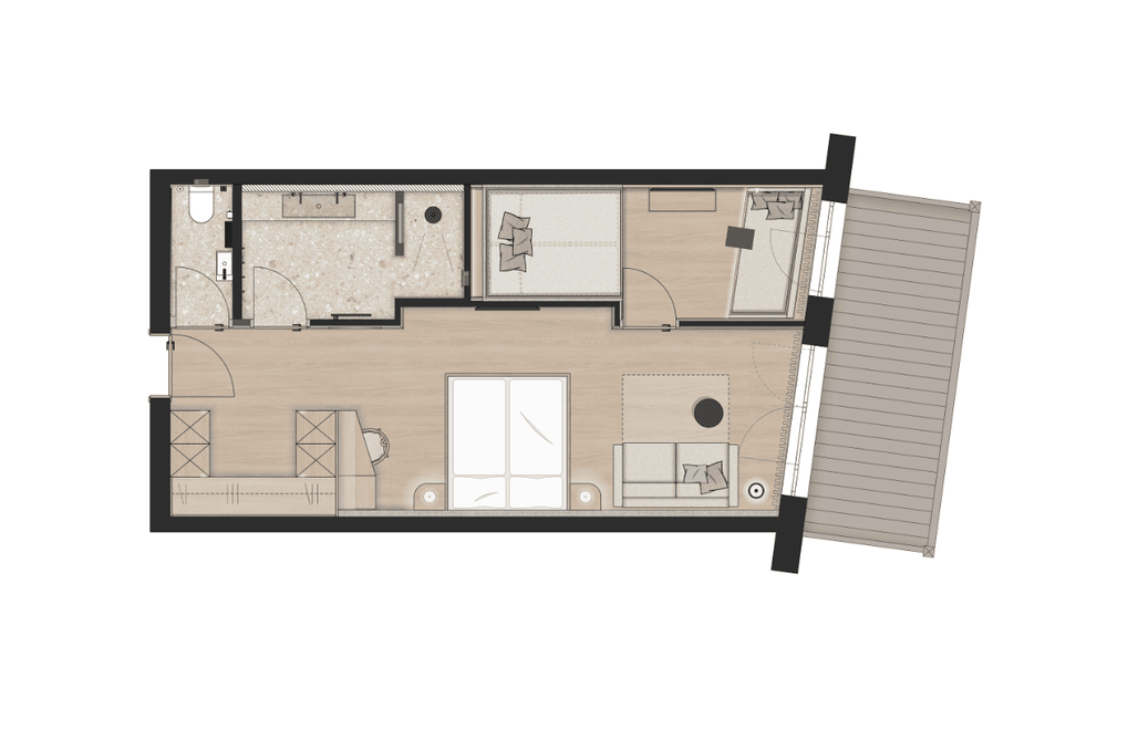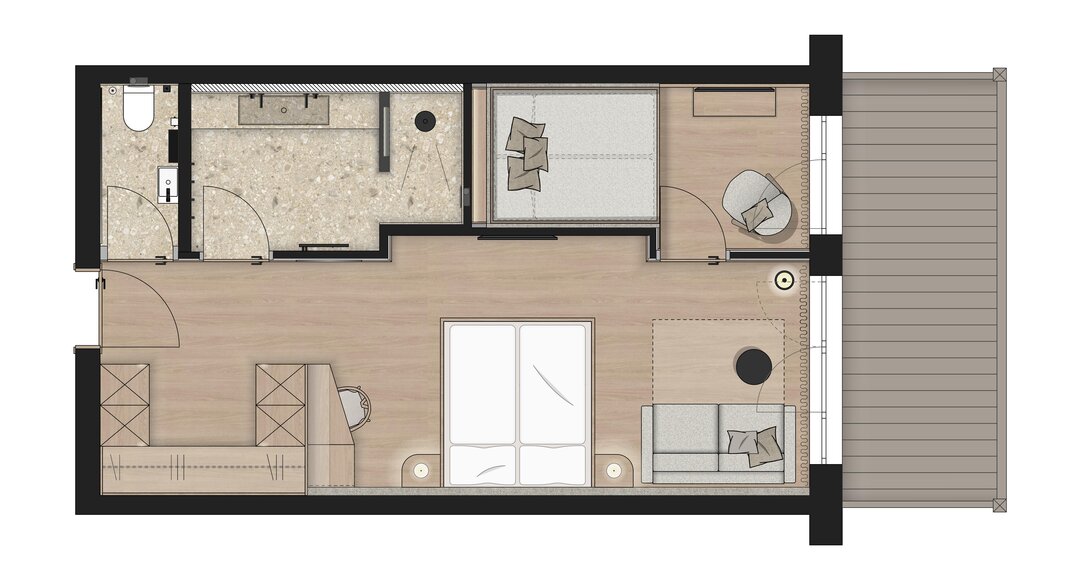 Room amenities: mini-bar, espresso machine / tea bar, flatscreen TV, WiFi, telephone, safe, pull-out sofabed, large 180 cm x 210 cm bed, wood floors, south-facing loggia with lounge chairs, private infrared sauna -
