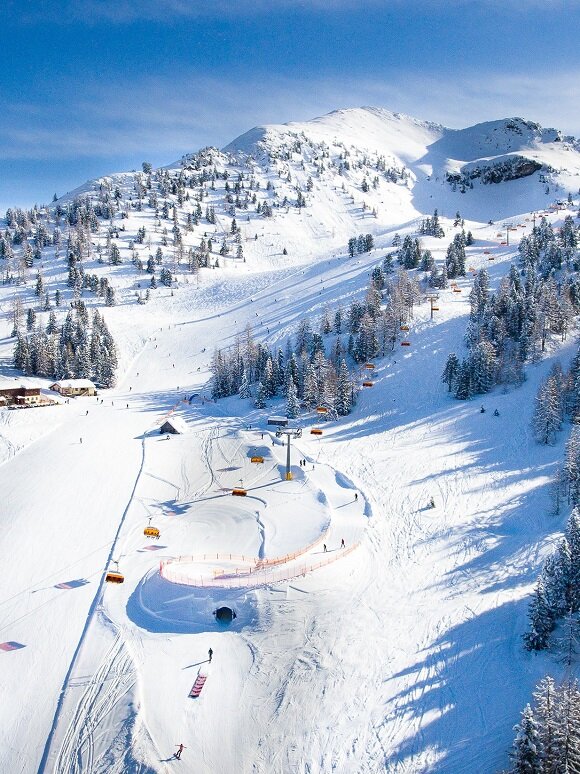 The Wollis Kids Park – a 24,000 square metre practice area in the valley – is the perfect place to prepare for your skiing or snowboarding fun. Once you reach the mountain, the action continues with the 1,460-metre-long XXL Funslope in the natural gem of Kaiblingalm. Afterwards, the Genussinsel (pleasure island) with its 360-degree panoramic loungers invites you to relax and linger.