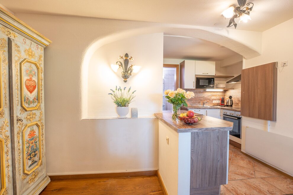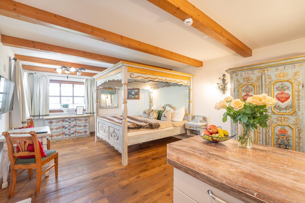 The apartment on the ground floor has a living-bedroom with a four-posted bed and an extra person finds on the sofa his sleeping place. There is a fully equipped kitchenette and a bathroom with shower and WC.