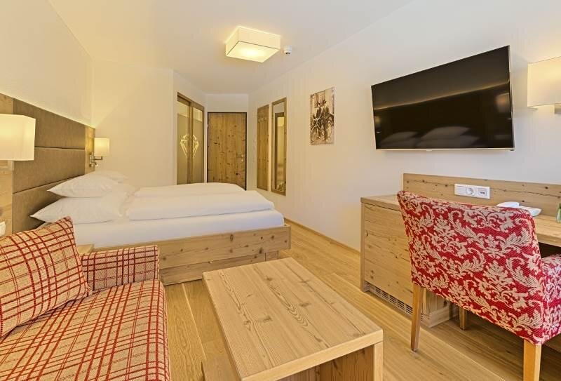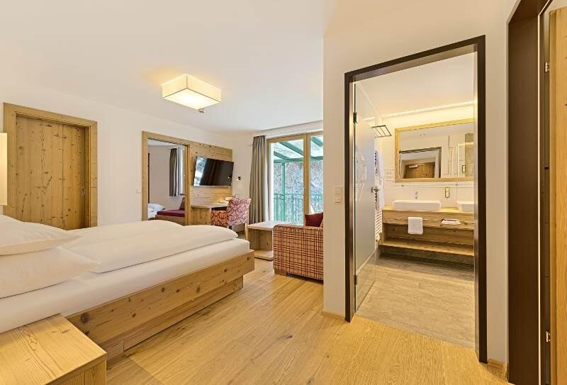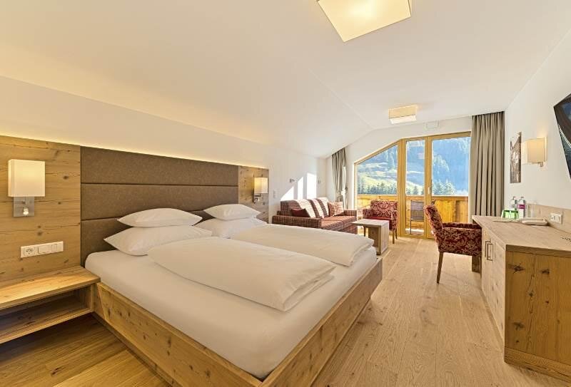 Krásny priestranný rodinný izba 40m² s dvoma oddelenými spálňami, balkónom, dubovými podlahami, kúpeľňou s bezbariérovou sprchou, rádiom a samostatným WC, fénom, útulným obývacím priestorom, písacím stolom, 48" palcovým káblovým TV, trezorom, širokopásmovým internetom, telefónom a parkoviskom.