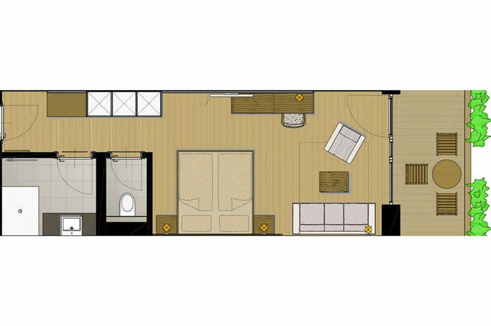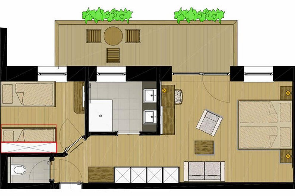 Krásny, priestranný dvojlôžkový izba 32 m² s opticky oddelenou obytnou časťou, balkónom, dubovou podlahou, kúpeľňou s bezbariérovým sprchovým kútom, rádiom a oddelenou toaletou, fénom, písací stôl, 48" palcový káblový televízor, trezor, širokopásmový internet, telefón, miesto v podzemnej garáži a s panoramatickým skleneným frontom na 3. poschodí.