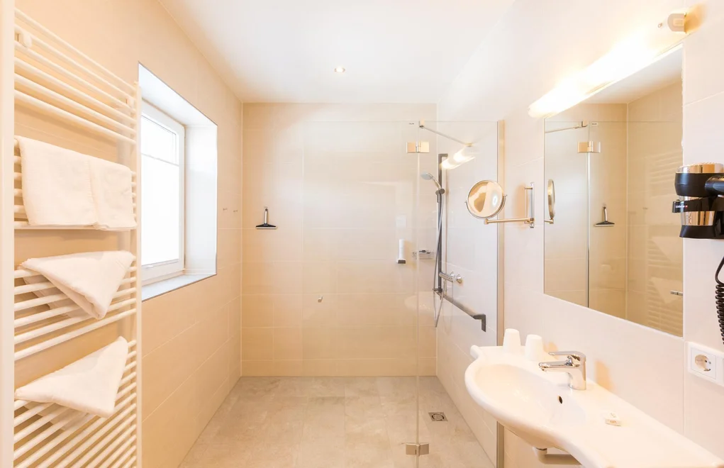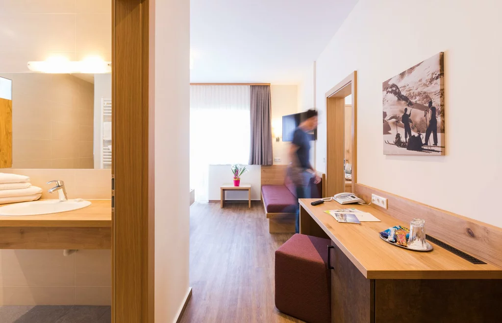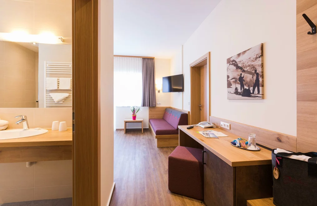 The spacious double rooms comfort are suitable for 2-3 persons. They are available both north- and east-facing. Facilities: seating, cable TV, flat screen, radio, telephone, hotel safe, shower or bath and WC, hairdryer, make-up mirror, heated towel dryer, bathrobe, minibar, balcony, free WiFi