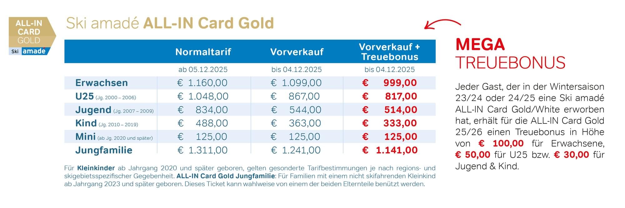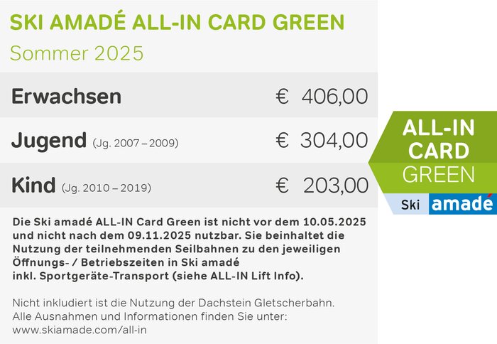 Wichtige Information: Die Ski amadé ALL-IN Card Green ist nicht vor dem 10.05.2025 und nicht nach dem 09.11.2025 nutzbar. Sie beinhaltet die Nutzung der teilnehmenden Seilbahnen zu den jeweiligen Öffnungs- / Betriebszeiten in Ski amadé inkl. Sportgeräte-Transport (siehe ALL-IN Lift Info). Nicht inkludiert ist die Nutzung der Dachstein Gletscherbahn und Sommerrodelbahnen.