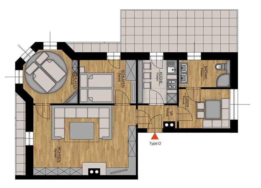 The luxury apartment with 78 m² is suitable for couples and families up to 6 persons. The living room contains a big pull-out couch. Furthermore, the whole living room has a beautiful wooden parquet floor with the same wood colour like the furniture. Next to the living room is the spacious designer kitchen, with the colours in the Chalet. Moreover, the kitchen has a direct access to the terrace through a big glas door.Ausstattung Zimmer/Appartement