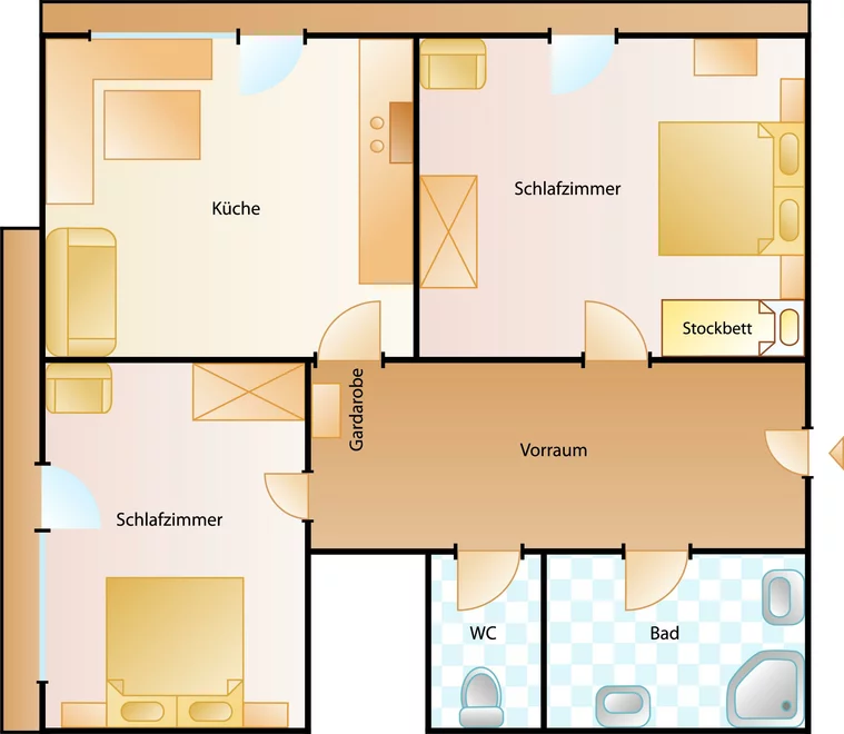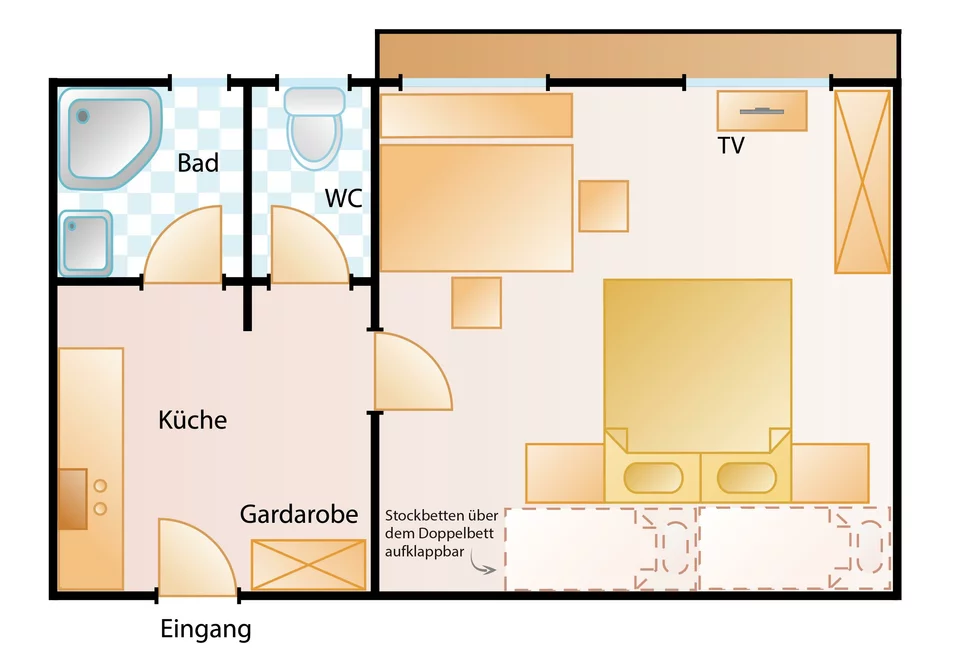 Getrennte Betten möglich, Zusatzliege, Couchliege, Sofa, Getrennte Betten, Zustellbett, Ausziehbare Couch, max. Pers.: 7, Doppelbett (1 Bett/2 Matratzen), Anzahl Stockbett/en: 1